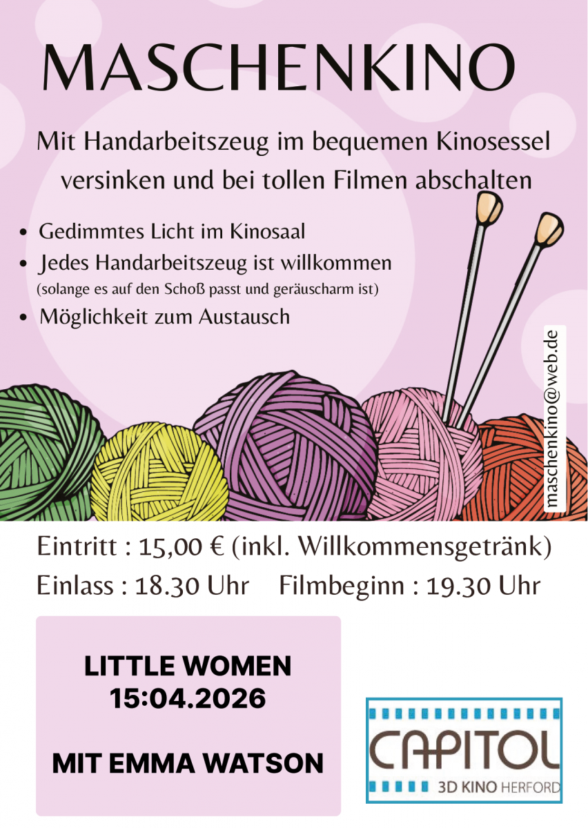 Am 15. April 2026 zeigen wir „Little Women“ mit Emma Watson 🌸🎬 – und ihr könnt dabei entspannt im Kinosessel sitzen und nebenbei stricken, häkeln oder handarbeiten, was das Zeug hält! 🪡🪢